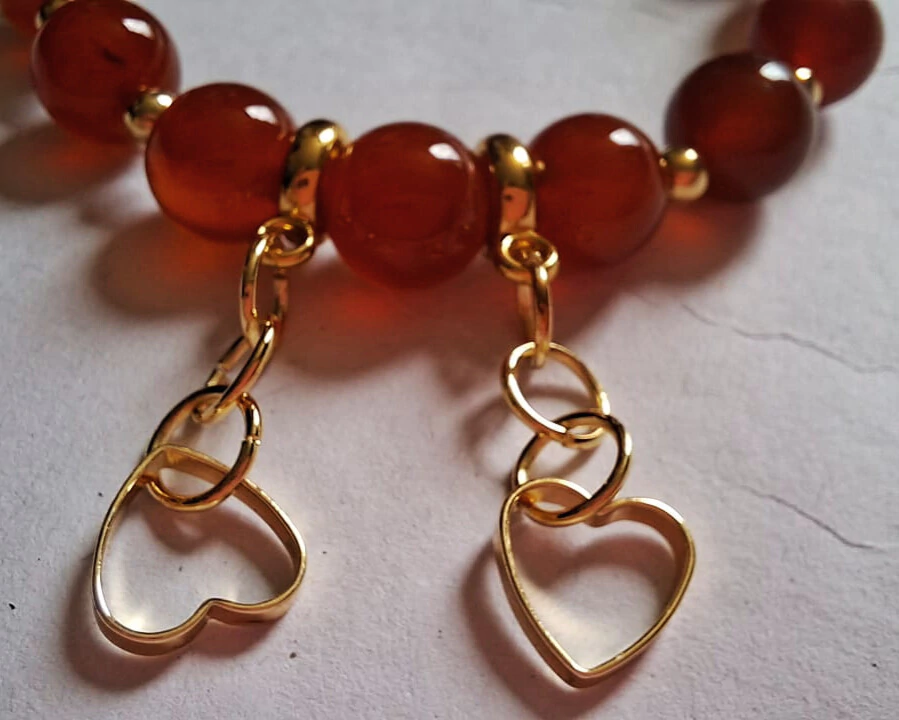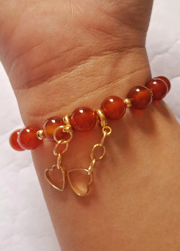 Essa pulseira combina a beleza terrosa da Ágata avermelhada natural com detalhes dourados discretos e pingentes de coração delicados, criando uma peça com vibe romântica e sutil.